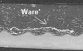- WARE - Horizontal "lines" (splits) generally due to a poor weld between layers of steel. Ware may occur anywhere on the blade (mune-ware, tate-ware, shinogi-ware, etc). These are very common.
