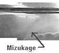 - MIZUKAGE - Cloudly line running diagonally from the ha (edge) near the ha-machi. This is commonly a sign that the blade has been retempered. While there were a few smiths that made mizukage deliberately, most often it is considered a flaw and indicator of a retempered blade. On retempered blades the hamon will sometimes stop in front of the ha-machi. Again, some smiths did this deliberately, but most commonly it is a sign of a retempered blade.