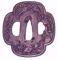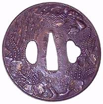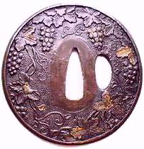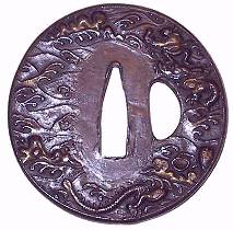 Sanmai tsuba are constructed of three sandwiched plates; a top and bottom plate of shakudo, shibuichi or nigurome with a center core normally of yamagane (copper). They are bound by a fukurin (rim) which holds the three plates together. This construction can be seen on the interior of the nakago-and or hitsu-ana (if any). The plate decoration is done by a repousse technique, working the design from the back of the plate, sometimes hammered into a pattern mold. Some sanmai tsuba will have the exact same design on both sides (the same plate design being used on the front and back); others will have different designs on each side of the tsuba. The plates are normally of floral, scenic, dragons or mon design. Some sanmai tsuba have Goto style designs. Commonly the plates will have some type of gold wash on areas of the design.