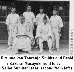 Ritsumeikan University in Kyoto had a small forge (tanrenjo) set up during World War II which made swords for the military and the war effort. The forge was led by Sakurai Masayuki, the second son of Sakurai (Manji) Masatsugu, a well known early gendai swordsmith. He originally signed Masatsuna. He worked in Fukuoka, Osaka, and Kyoto (Ritsumeikan University). He was an early teacher of Seiho Sumitani (Sumitani Masamine), who became a Ningen Kokuho Tosho (Living National Treasure Swordsmith) from Kanazawa.
